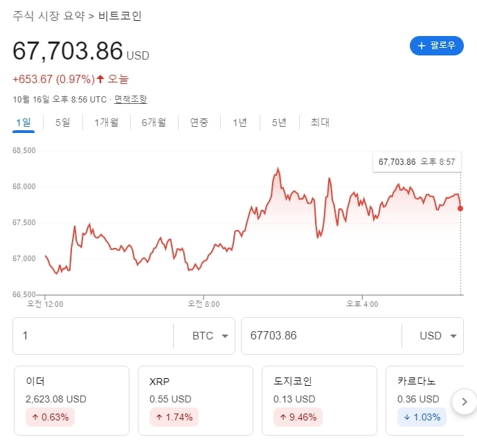 비트코인 가격은 지난 5일 동안 약 8.7% 올라서 현재 약 6만7000달러대 후반에서 거래되고 있습니다. 올 들어서는 53% 올랐고요. 시총 2위 이더리움 가격도 이 기간 동안 7.6% 상승한 2621달러에 거래되고 있습니다. 어제 오후부터 오늘 아침까지의 상황을 보면 비트코인이 좀 더 많이 올랐고 이더리움이나 다른 코인의 가격은 횡보세를 보였습니다.