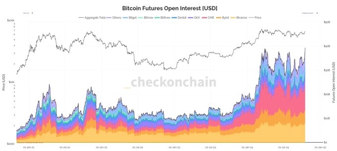 17일 온체인 분석업체 글래스노드의 수석 애널리스트 체크메이트는 엑스(트위터)를 통해 "비트코인 선물 미결제약정이 최대 수준을 보이고 있다"고 전했다.