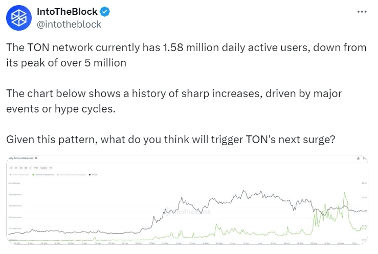 가상자산(암호화폐) 마켓 데이터 분석 플랫폼 인투더블록이 21일(현지시간) X(구 트위터)를 통해 "디오픈네트워크(TON)의 일일 활성 사용자 수가 22일(한국시간) 기준 158만 명을 기록했다"라며 "최고치(500만명) 대비 68% 감소한 것"이라고 전했다.