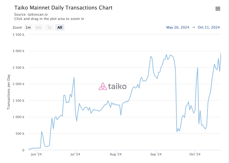 - 타이코(TAIKO)가 영지식 기반 이더리움 레이어2 네트워크로서 주목받고 있는 가운데, 일일 트랜잭션 수가 최고치를 기록했다고 밝혔다.