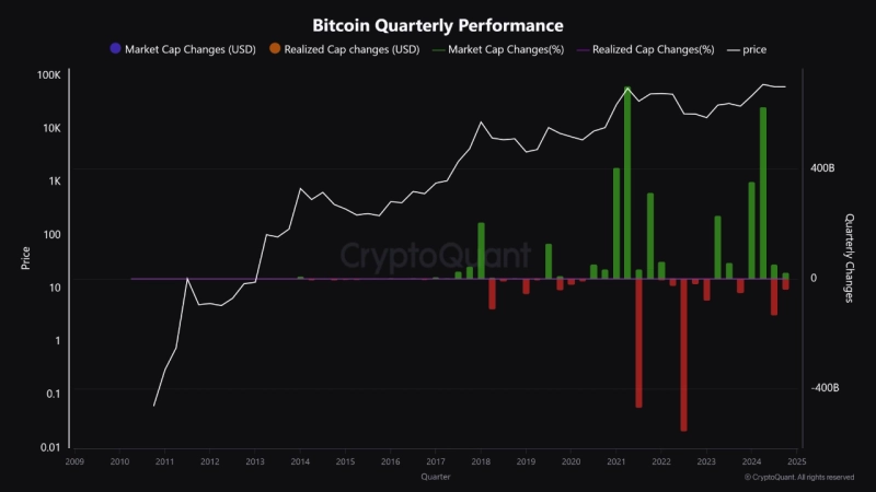 분석가는 크립토퀀트의 '비트코인 분기 성과(Bitcoin Quarterly Performance)' 지표를 인용 "시가총액과 실현 시가총액을 비교하면 강세와 약세 추세에 대한 신호를 발견할 수 있다"면서 "시가총액이 실현 시가총액을 압도하는 경우 (과열로 인한) 광범위한 매도 압력이 발생할 수 있다"라고 설명했다.