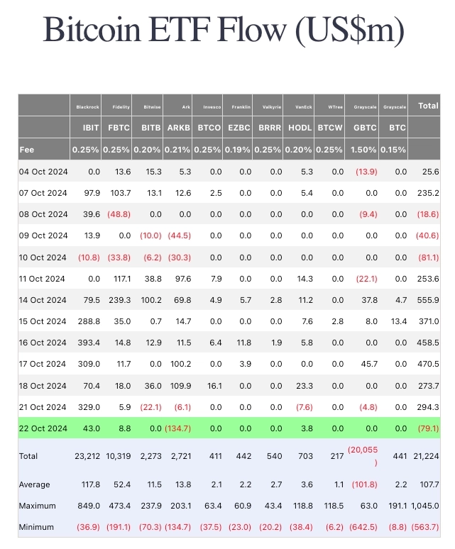비트코인 현물 상장지수펀드(ETF)는 지난주(지난 14일\~18일) 21억2900만달러(약 2조 9363억)가 순유입됐다. 가상자산 운용사 코인셰어즈는 지난 21일 “지난주 공화당의 미국 대선 승리에 대한 낙관적 전망에 힘입어 상당한 규모의 자금 유입이 발생했다. 자금 유입은 지난 7월 이후 최대 규모를 기록했다”라고 설명했다.