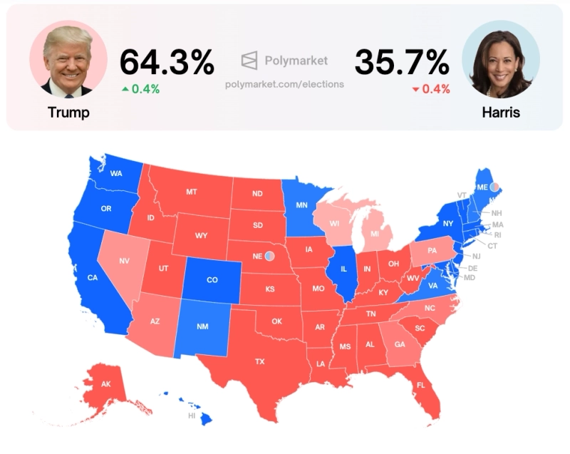 미국 대선에서 트럼프 전 대통령의 당선 확률이 높아지고 있다는 전망에 힘이 실리면서 비트코인·금·달러가 상승세를 나타내고 있다. 23일 블록체인에 기반한 정치 베팅 사이트 폴리마켓은 트럼프 후보의 당선 확률은 64.3%, 민주당 대선 후보인 카멀라 해리스 부통령의 당선 확률은 35.7%로 각각 전망하고 있다.