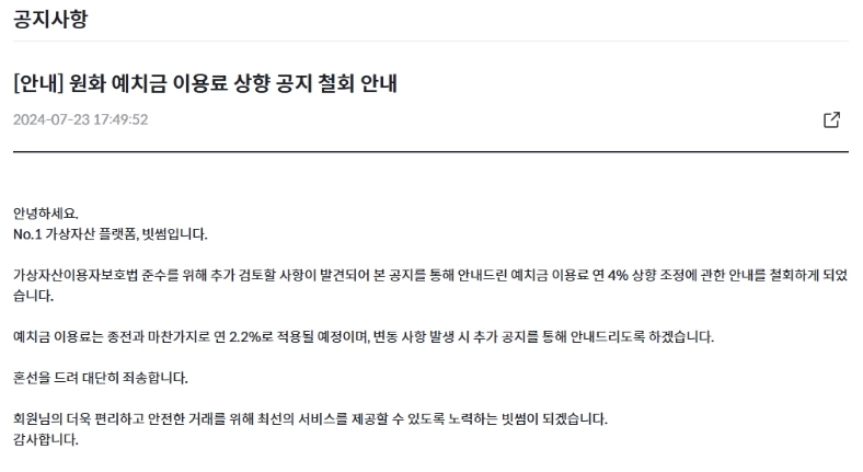 현행 가상자산이용자보호법은 거래소가 이용자의 예치금을 은행에 보관 및 관리하며, 예치금 이용료를 이용자에게 지급해야 한다고 명시하고 있다. 이에 따라 7월 19일 업비트가 1.3% 이용료율을 공지하자 뒤이어 빗썸과 코빗은 각각 2%, 1.5%의 이용료율을 발표했다.