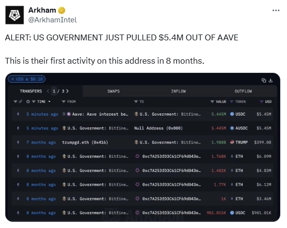 - 미국 정부가 에이브(AAVE)에서 112만달러 상당의 USDT를 추가로 출금했다고 전했다.