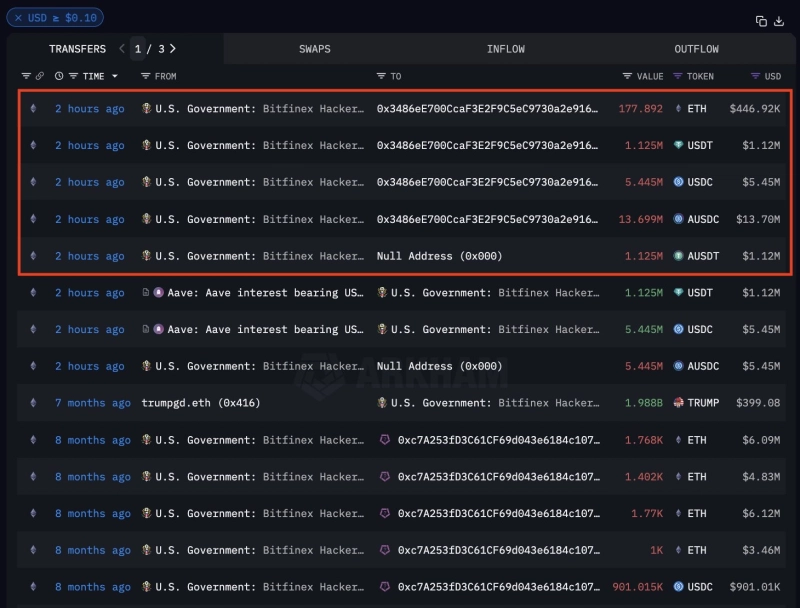24일(현지시각) 아캄 인텔리전스는 X를 통해 "미국 정부 소유 주소가 2000만 달러 가상자산 해킹 피해를 입었다"라며 "9개의 미국 정부 추정 주소에서 1,400만 AUSDC, 540만 USDC, 110만 USDT, 50만 달러 상당 ETH 등이 외부 주소로 이체됐다"라고 밝혔다. 해당 가상자산은 비트파이넥스 해커로부터 압수한 자금으로 추정된다.