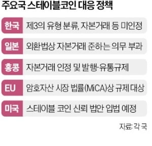 유럽연합(EU), 일본, 홍콩 등 주요국도 스테이블 코인 대응 방안을 잇따라 내놓고 있다. 한국 정부는 스테이블 코인 등 가상자산의 국경 간 거래에서 자금세탁 방지와 불법 자본 유출 차단 등에 초점을 맞추고 있지만, 주요국은 스테이블 코인의 투명성과 안정성 확보에 관심을 두고 있다.