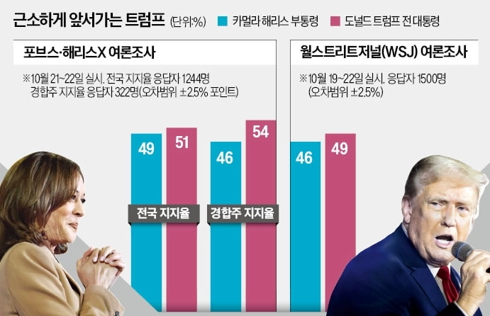 트럼프 전 대통령이 앞서 나가는 것은 다른 여론조사에서도 드러났다. 월스트리트저널(WSJ)이 19일부터 나흘간 미국 전역 등록 유권자 1500명을 상대로 한 여론조사에서도 트럼프 전 대통령에게 투표하겠다는 응답(47%)이 해리스 부통령에게 투표하겠다는 응답(45%)보다 2%포인트 높았다. 이는 로버트 F 케네디 주니어를 후보에 포함한 결과다.