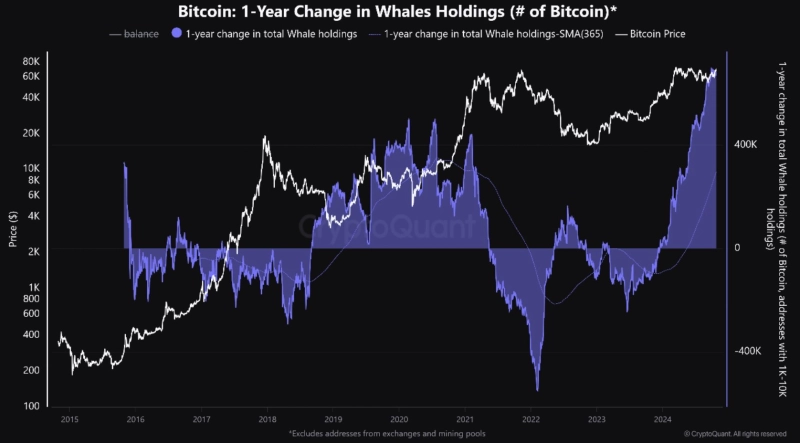 25일(현지시각) 크립토퀀트는 X를 통해 "고래의 비트코인 보유량이 사상 최고치에 도달했다"라며 "현재 약 67만BTC를 보유 중"이라고 말했다. 이어서 "이는 의심할 여지 없는 낙관적 신호"라고 덧붙였다 .