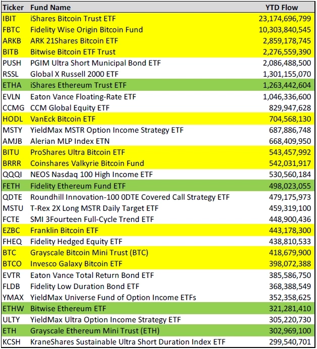 올해 출시된 ETF 575개 가운데 비트코인과 이더리움 ETF가 상위 30개 중 14개를 차지한 것으로 나타났다.