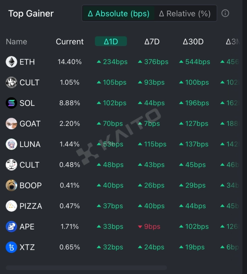 27일 인공지능(AI) 기반 웹3 서치 플랫폼 카이토(Kaito)의 토큰 마인드셰어(Token Mindshare, 가상자산 시장 내 특정 토큰의 영향력을 정량화한 지표) 탑게이너에 따르면 22일 현재 사람들이 가장 많이 관심을 보이고 있는 가상자산(암호화폐) 관련 키워드 상위 5개는 이더리움(ETH), 컬트다오(CULT), 솔라나(SOL), 고트(GOAT), 루나바이버츄얼스(LUNA) 등이다.