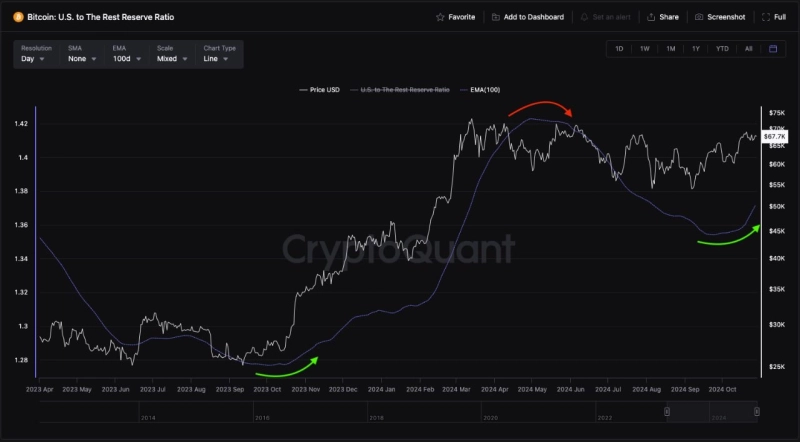 28일(현지시간) 온체인 분석 플랫폼 크립토퀀트는 공식 엑스(트위터)를 통해 "올해 3월 이후 비트코인 가격이 상승하지 못하고 지속 횡보를 보인 이유는 미국 법인들의 비트코인 보유 비율이 감소했기 때문이었으나, 최근 거래소, 은행, 펀드 등 미국 기관의 비트코인 보유 비율이 증가하기 시작했다"라고 설명했다.