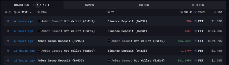 30일 온체인 애널리스트 더 데이터 너드(The Data Nerd)는 X(옛 트위터)를 통해 "앰버그룹은 이날 오전 11시경(현지시간) 바이낸스로 43만5000 FET를 입금했다"면서 "해당 주소는 지난 24시간 동안 총 151만 FET를 입금했다. 이는 약 202만달러(약 27억원) 규모다"라고 전했다.