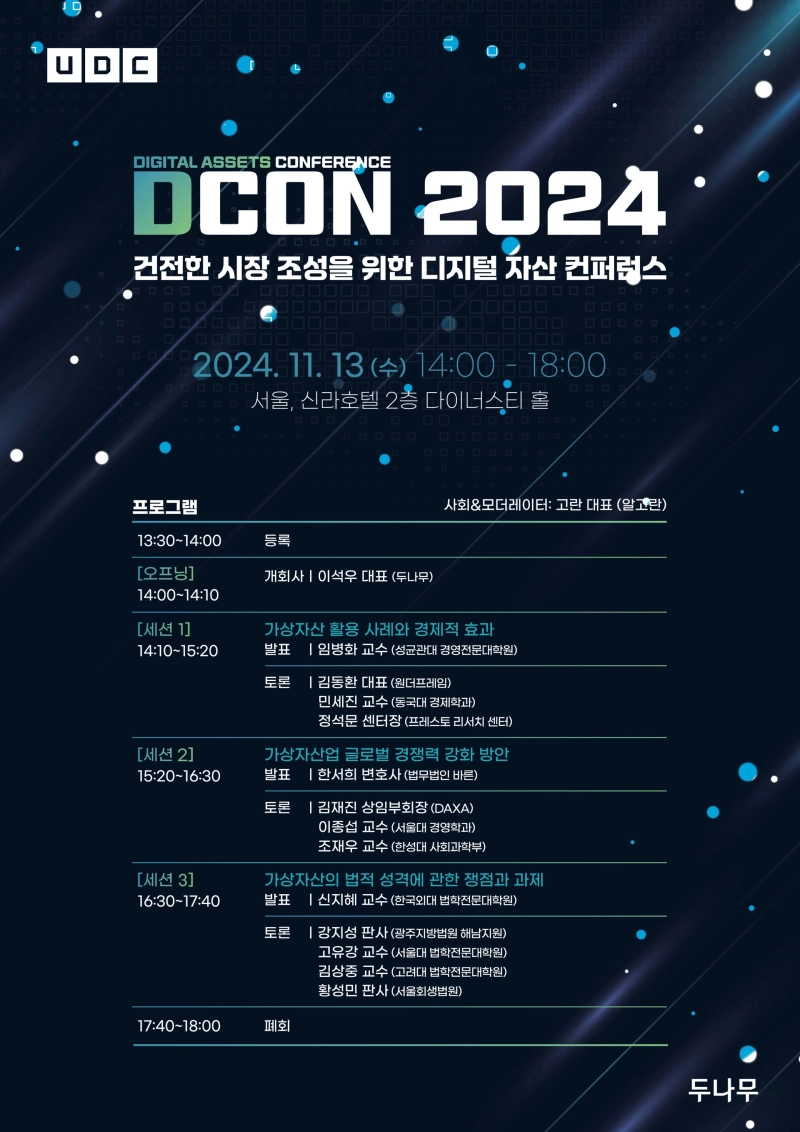 - 두나무는 11월 13일 디지털 자산 활용 사례와 법적 성격, 산업 경쟁력 강화 방안을 논의하는 'D-CON 2024'를 개최한다고 밝혔다.