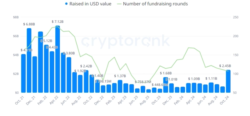 31일(현지시간) 가상자산(암호화폐) 전문매체 크립토폴리탄에 따르면 가상자산 벤처캐피털(VC)가 지난 10월 유치한 금액은 전월대비 263% 급증한 20억달러를 기록했다. 가상자산 투자 라운드는 총 107건이 진행됐으며, 투자 라운드의 평균 규모는 300만\~1000만달러 사이로 나타났다.