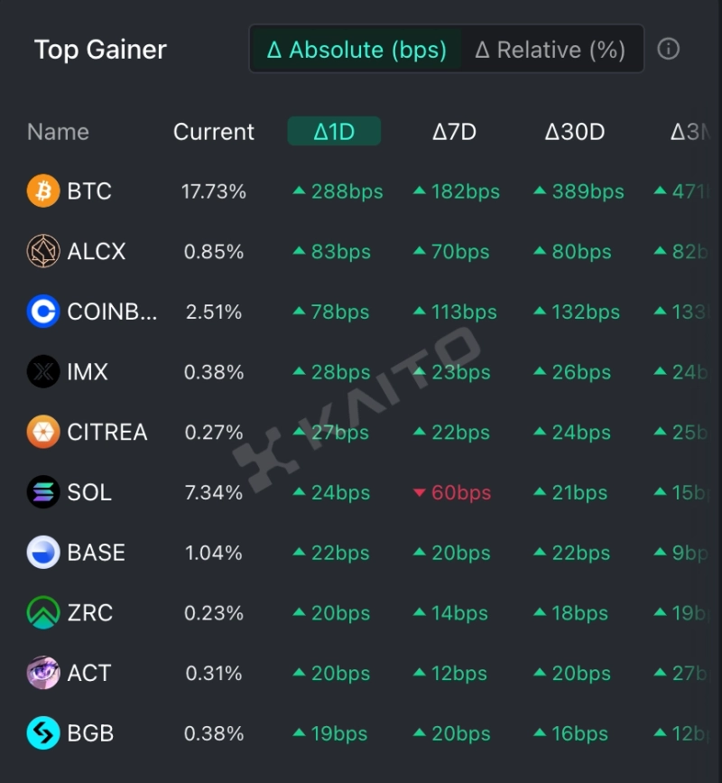 - Kaito의 조사에 따르면, 비트코인은 1위로 급락한 이유로 볼 수 있으며, 이는 비트코인의 높은 변동성을 반영한다고 밝혔다.