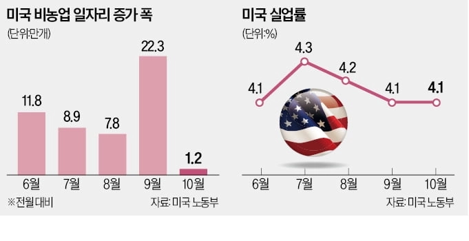 1일 미 노동부에 따르면 올 10월 비농업 신규 일자리는 전월 대비 1만2000개 증가하는 데 그쳤다. 전월 22만3000개에 턱없이 못 미쳤을 뿐 아니라 다우존스가 집계한 전문가 추정치인 11만 개도 한참 밑돌았다. 1만2000개 증가는 코로나19 사태가 확산하기 직전인 2020년 12월 이후 최악의 수치다. 10월 실업률은 4.1%로 전월과 같았으며 전문가 추정치에도 부합했다. 시간당 평균임금 상승률은 전월 대비 0.4%로 추정치(0.3%)를 웃돌았다.