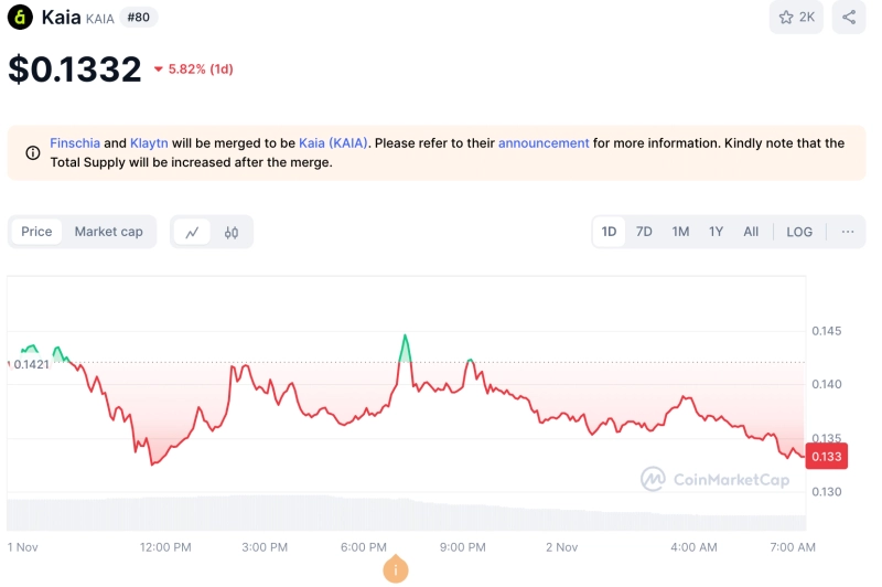 2일 오전 7시 24분 현재 카이아는 코인마켓캡 기준 전일대비 5.91% 하락한 0.1333달러를 기록 중이다.