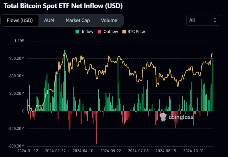 최근 들어서도 암호화폐에 우호적인 도널드 트럼프 전 대통령의 재선 가능성이 높아지면서 뭉칫돈이 몰리고 있다. 지난 10월 30일 하루 동안에만 약 8억7000만달러가 비트코인 현물 ETF에 들어왔다. 비트코인 현물 ETF가 출시된 연초 이후 하루 기준 세번째로 많은 유입액이다. 10월 유입 자금도 50억달러에 달했다.
