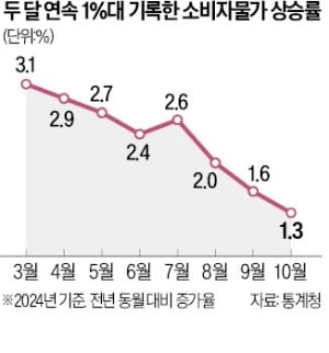 10월 소비자물가가 전년 동월 대비 1.3% 오르면서 코로나19 팬데믹 이후 3년9개월 만에 물가 상승률이 가장 낮았다. 지난달에 이어 두 달 연속 1%대 상승률을 기록하며 둔화 흐름을 이어갔다.