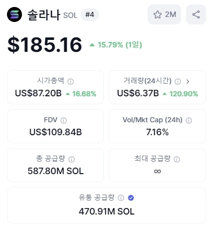 6일 오후 2시 3분 현재 솔라나는 코인마켓캡 기준 전일대비 15.79% 급등한 185.16달러를 기록 중이다. 시가총액은 872억달러를 기록, 바이낸스코인(BNB)을 제치고 전체 가상자산(암호화폐) 시가총액 순위 4위로 올라섰다.