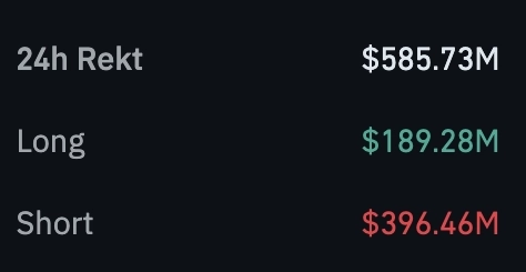 6일(현지시각) 코인텔레그래프는 X를 통해 "지난 24시간 동안 5억8500만 달러가 청산당했다"라고 밝혔다. 이 중 롱(매수) 포지션은 1억8900만 달러, 숏(매도) 포지션 3억9600만 달러가 청산됐다.