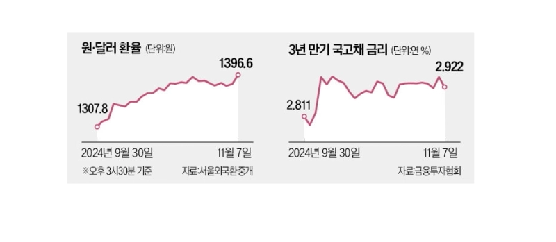 도널드 트럼프 전 미국 대통령의 재선 성공에 원·달러 환율이 1400원 안팎까지 오르면서 한국은행 통화정책의 핵심 변수로 떠올랐다. 물가상승률이 1%대 초반까지 내리고 3분기 성장률이 기대에 미치지 못하면서 기준금리 인하 필요성이 커졌지만 고환율 부담에 금리 인하를 결정하기 어려워진 상황이라는 분석이 나온다.