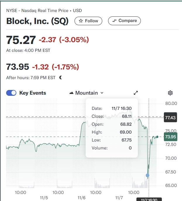 8일 야후 파이낸스에 따르면 블록은 전날 나스닥에서 전일대비 3.05% 하락한 75.27달러로 장을 마감했다. 그러나 장외 시장에서 매도세가 몰리더니 한 순간에 주가가 66달러까지 하락했다. 현재는 낙폭을 줄여 73.95달러를 기록하고 있다.