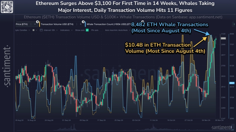 11일(현지시간) 가상자산(암호화폐) 분석 플랫폼 샌티먼트는 X(옛 트위터)를 통해 "최근 이더리움 고래의 온체인 활동이 급증해 최근 상승세에 영향을 미쳤다"고 분석했다.