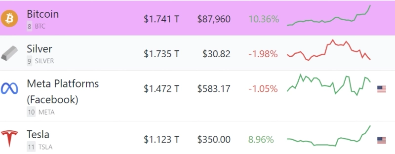 파죽지세로 상승세를 이어가며 8만8000달러도 돌파한 비트코인(BTC)이 은(Silver)의 시가총액을 추월한 것으로 나타났다.
