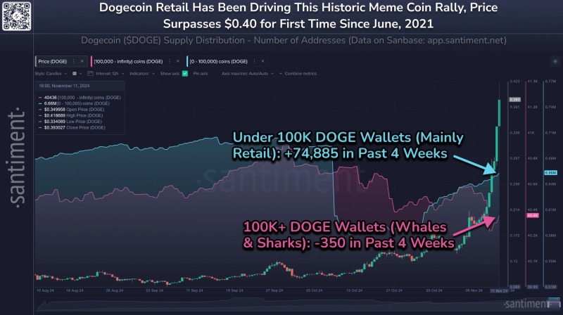 이날 가상자산(암호화폐) 데이터 분석업체 샌티멘트는 "지난 4주 동안 DOGE를 10만개 미만 보유한 지갑은 7만4885개 늘었다"면서 "고래·상어 지갑 수도 며칠 새 108개가 늘었다"라고 분석했다.
