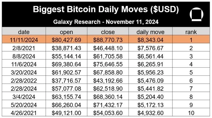 12일 가상자산(암호화폐) 전문 미디어 코인텔레그래프는 "비트코인은 지난 11일 하루 만에 8만427달러에서 8만8770달러까지 약 8400달러 급등하면서 비트코인 역사상 높은 상승폭을 기록했다"라고 전했다. 앞서 지난 최고 변동치는 2021년 8월 2일 나타난 바 있다. 당시 비트코인은 3만8871달러에서 4만6448달러까지 7576달러 올랐다.