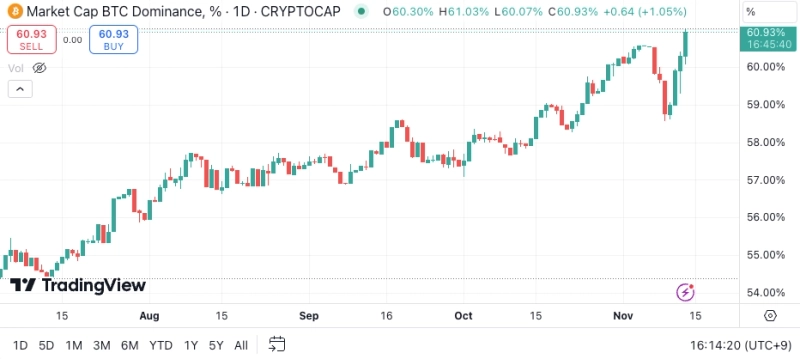 비트코인(BTC) 도미넌스(가상자산 전체의 시가총액 중 비트코인이 차지하는 비중)가 상승세를 지속하며 61%를 터치했다.