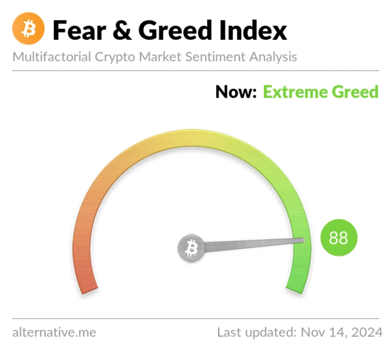 14일 가상자산 데이터 제공 업체 얼터너티브에 따르면 가상자산 공포·탐욕 지수는 전일대비 4포인트 오른 88점을 기록했다.
