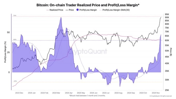 14일 줄리오 모레노 크립토퀀트 기고자는 엑스(트위터)를 통해 "비트코인 단기 보유자들의 현재 수익률이 47%에 달하고 있다. 통상적으로 단기 보유자들의 수익률이 높을수록 조정 가능성이 커진다"고 설명했다.