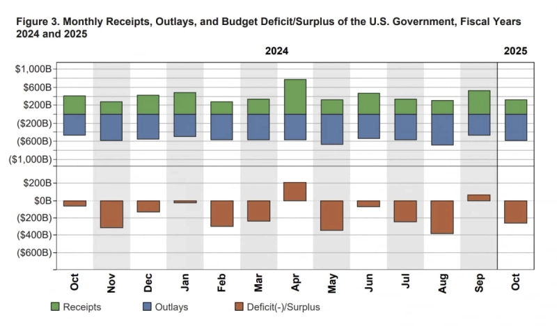 보고서에 따르면 10월 연방 수입은 전년 동기 대비 770억달러(약 19%) 줄어든 3270억달러를 기록했고, 10월 지출은 1140억달러(약 24%) 늘어난 5840억달러로 집계됐다. 사회보장, 의료보험, 군사비 지출은 늘었으나 공공 서비스 지출액은 70억달러(약 8%) 감소했다. 로이터통신은 "지난해 8월 이후 처음으로 공공 서비스 지출액이 전년 대비 줄었다"고 설명했다.