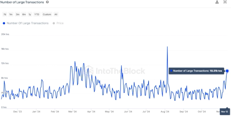 14일 블록체인 분석 회사 인투더블록(IntoTheBlock)은 X(옛 트위터)를 통해 "이더리움 고래 투자자들이 깨어나고 있다. 일일 발생하는 대형 (이더리움) 트랜잭션 수는 최근 1만건을 돌파했다"라고 밝혔다.