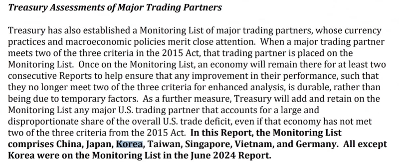 한국은 지난 보고서에서 대미 무역 흑자라는 한 가지 기준만 충족했었으나 이번에는 경상수지 흑자 규모가 늘어나며 관찰대상국으로 재지정됐다. 보고서에 따르면 2024년 6월까지 4분기 동안 한국의 경상수지 흑자는 전년 동기 GDP의 0.2%에서 3.7%로 올랐다. 대미무역 흑자도 380억달러에서 500억달러로 크게 뛰었다. 재무부는 "한국의 기술 관련 제품에 대한 강력한 대외 수요로 인한 상품 흑자 증가에 힘입은 것"이라며 "에너지 가격 인하와 기술 관련 수출의 반등으로 한국의 교역 조건이 회복됐다"고 설명했다.