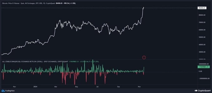 가상자산(암호화폐) 시장에서 현금 역할을 하는 스테이블코인의 거래소 유입이 증가세를 띠고 있다. 이에 비트코인(BTC)의 상승 여력이 남았다는 분석이 나온다.