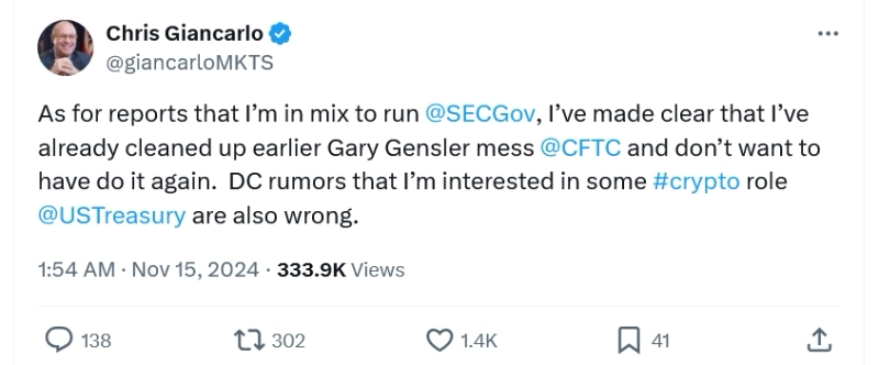 14일(현지시간) 가상자산 전문 매체 코인텔레그래프에 따르면 크리스 지안카를로 전 CFTC 위원장은 엑스(트위터)를 통해 "CFTC에서 게리 겐슬러의 난장판을 치웠고 다시는 그런 일을 하고 싶지 않다"라며 자신을 향한 루머를 일축했다.