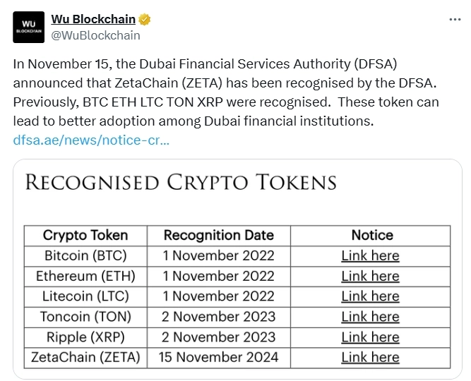 - 두바이금융서비스국(DFSA)가 제타체인(ZETA)을 공인 가상자산 목록에 추가했다고 전했다.