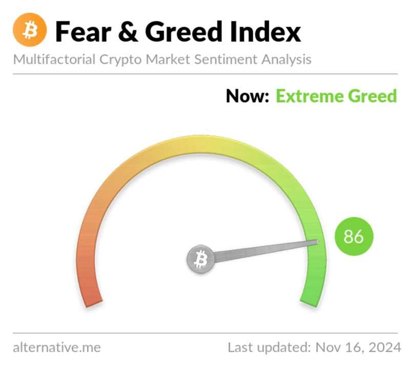 16일 가상자산 데이터 제공 업체 얼터너티브에 따르면 가상자산 공포·탐욕 지수는 전일대비 6점 오른 86점을 기록했다. 극단적인 탐욕 단계를 지속했다.