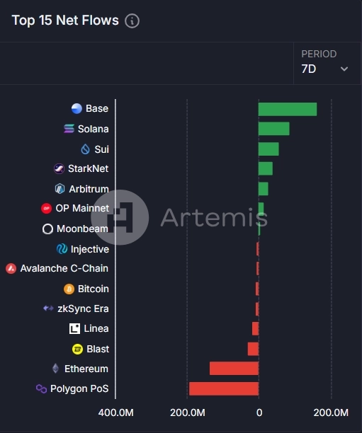 16일 우블록체인은 엑스(트위터)를 통해 분석업체 아르테미스의 데이터를 공유하며 베이스 네트워크가 지난 7일 동안 자금 순유입 규모에서 1위를 차지했다고 전했다.