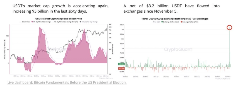 스테이블코인의 시가총액 증가로 인한 가상자산 시장 유동성 개선도 비트코인의 가격 상승에 긍정적인 영행을 미치고 있다는 평가다. 실제로 미국 대선 이후 약 32억달러 규모의 테더(USDT)가 가상자산 거래소로 입금됐는데, 이는 2021년 11월 이후 테더의 일일 순 유입량 중 가장 높은 수치다,