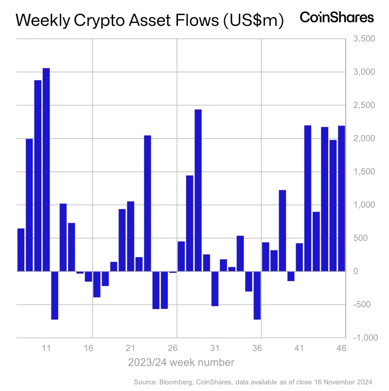 - 디지털 자산 운영사 코인쉐어즈는 지난주 디지털 자산 투자 상품에 22억 달러의 추가 자금이 유입되었다고 밝혔다.