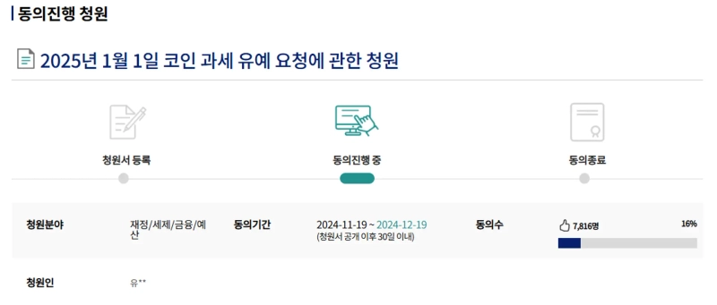 - 청원은 2025년 1월 1일 코인 과세 유예 요청에 관한 것이며, 현재 7816명의 동의를 받았다고 밝혔다.