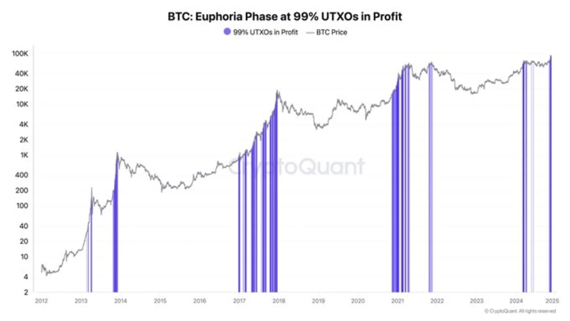 20일 주기영 크립토퀀트 대표는 엑스(트위터)를 통해 "UTXO의 99.3%가 수익권에 진입했다. 모두가 행복한 상태다. 일반적으로 이 단계는 3~12개월 동안 지속될 수 있다"고 말했다.
