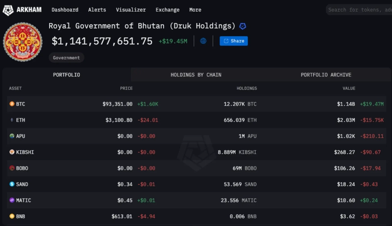 20일 블록체인 분석 플랫폼 아캄 인텔리전스에 따르면 부탄 정부는 1만2207 BTC를 보유하고 있다. 이는 11억4157만달러로 부탄 GDP의 약 34%에 해당한다. 한편 부탄은 인구 80만명의 소규모 왕국이기 때문에 GDP가 29억달러에 불과하다.