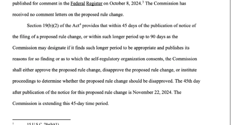 이날 발송한 서한에서 SEC 관계자는 "크립토 인덱스 ETF를 상장하기 위해 제안된 규칙 변경을 발표한 후 아무런 의견도 얻지 못했다"며 "SEC는 제안된 규칙 변경에 대한 조치를 고려했을 때 보다 많은 시간을 두고 검토하는 것이 적절하다고 판단했다"고 말했다.
