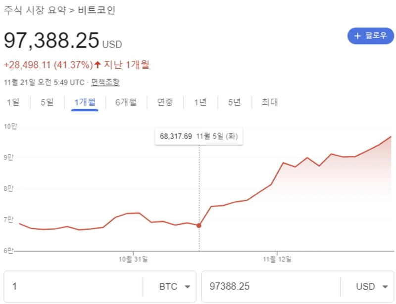비트코인 가격은 이날 오후 9만4000달러대에서 9만7000달러대로 급등했다. 1년 전 3만6000달러대였던 것과 비교하면 150% 뛰었다. 국내서도 비트코인은 이날 오후 1시께 24시간 전 대비 6.7% 오른 1억3770만원에 거래됐다. 암호화폐 상장지수펀드(ETF) 가격도 가파르게 치솟았다. 아이셰어즈 비트코인 트러스트의 자산 규모는 400억달러를 넘어섰다. 다른 비트코인 ETF 자산도 이날 1~2% 안팎의 상승률을 기록했다.